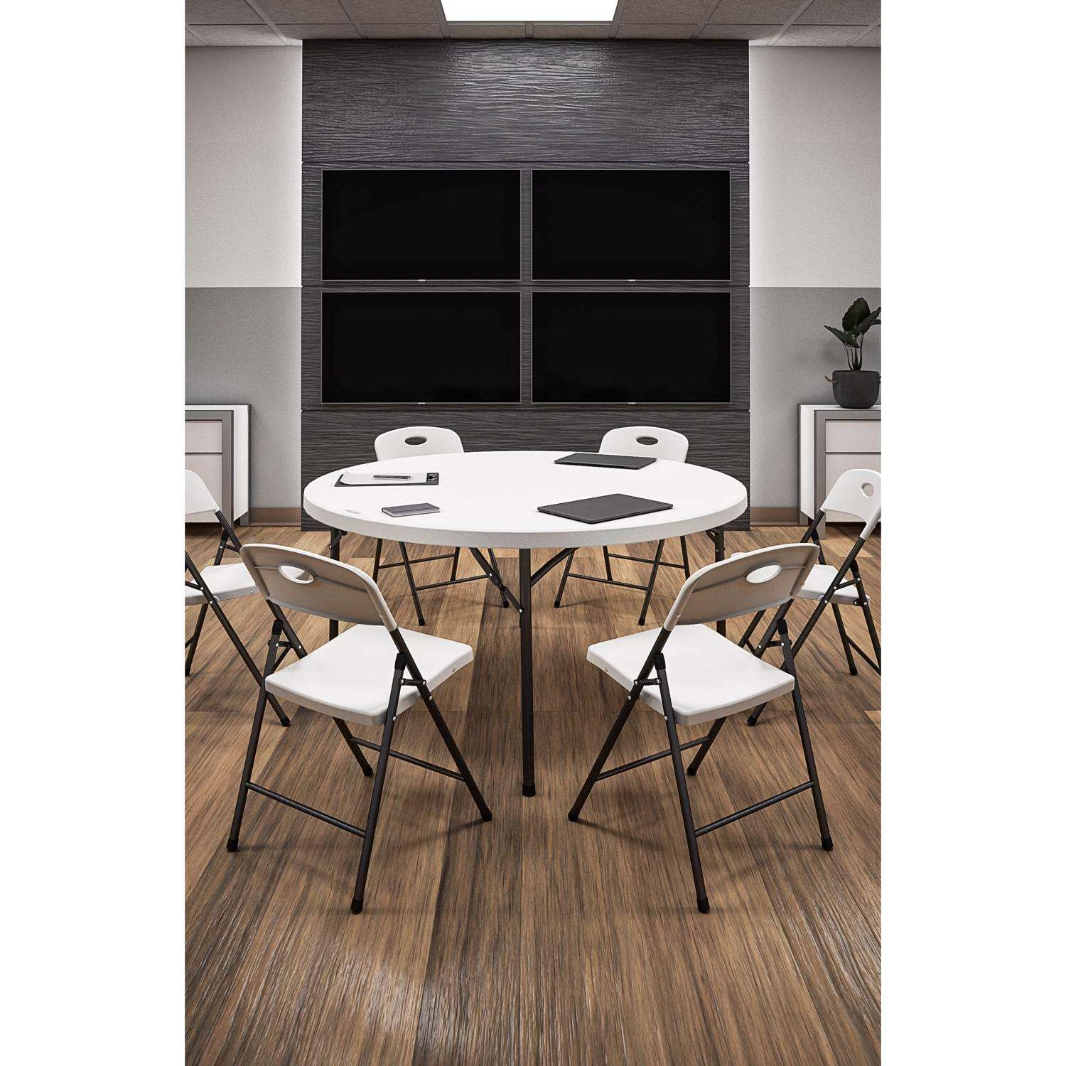 Enjoy your next get together using this Cosco 5 ft. round folding table. This table is your trusted solution when it comes to banquets, weddings, conferences and get togethers. This heavy-duty table is ready for any occasion. Folding flat, you can rest easy knowing this product provides compact storage in your home or garage. This product offers non-marring foot caps that prevents slipping and helps protect any floor surfaces from scratches or damage. When the day is done, simply wipe down this easy to clean table using a damp cloth. Constructed of a durable all-steel frame and resin top, this table has a weight capacity rating of up to 300 lbs. Great for banquets, weddings, conferences and get togethers Comfortably seats up to six people at a time Heavy-duty and ideal for indoor/outdoor use Folds flat for compact storage in any home or garage space