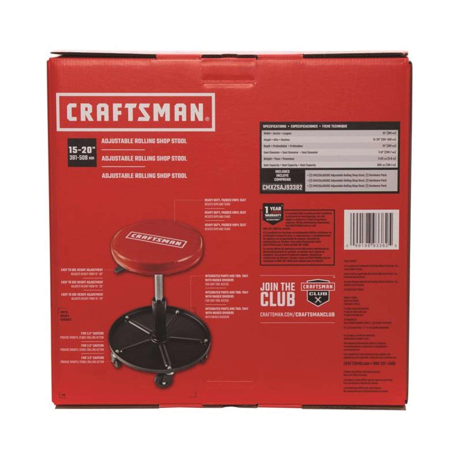 Whether you are detailing a vehicle interior, removing wheels and changing brake pads, or just tinkering with a motorcycle engine, put yourself at the perfect height to do the job with this adjustable rolling shop stool. To put you at the perfect height for the task at hand, the pneumatic gas cylinder has 4.5 inch of adjustability letting you work low to the ground at 15.5 inch or at its full height of 20 inch with the press of a lever. The five 2.5-inch diameter caster wheels provide smooth and stable rolling across multiple surfaces and let you maneuver easily around cars, trucks, tool chests, and other garage and workshop obstacles with ease. For added versatility, the bottom of the stool sports a 15-inch diameter storage tray with 5 raised dividers to keep additional tools, parts, and supplies close at hand. Heavy-duty, the padded vinyl seat is easy to clean and resists rips and tears No tools required for assembly This wheeled work stool features a rip and tear resistant vinyl seat that can easily support up to 300 lbs