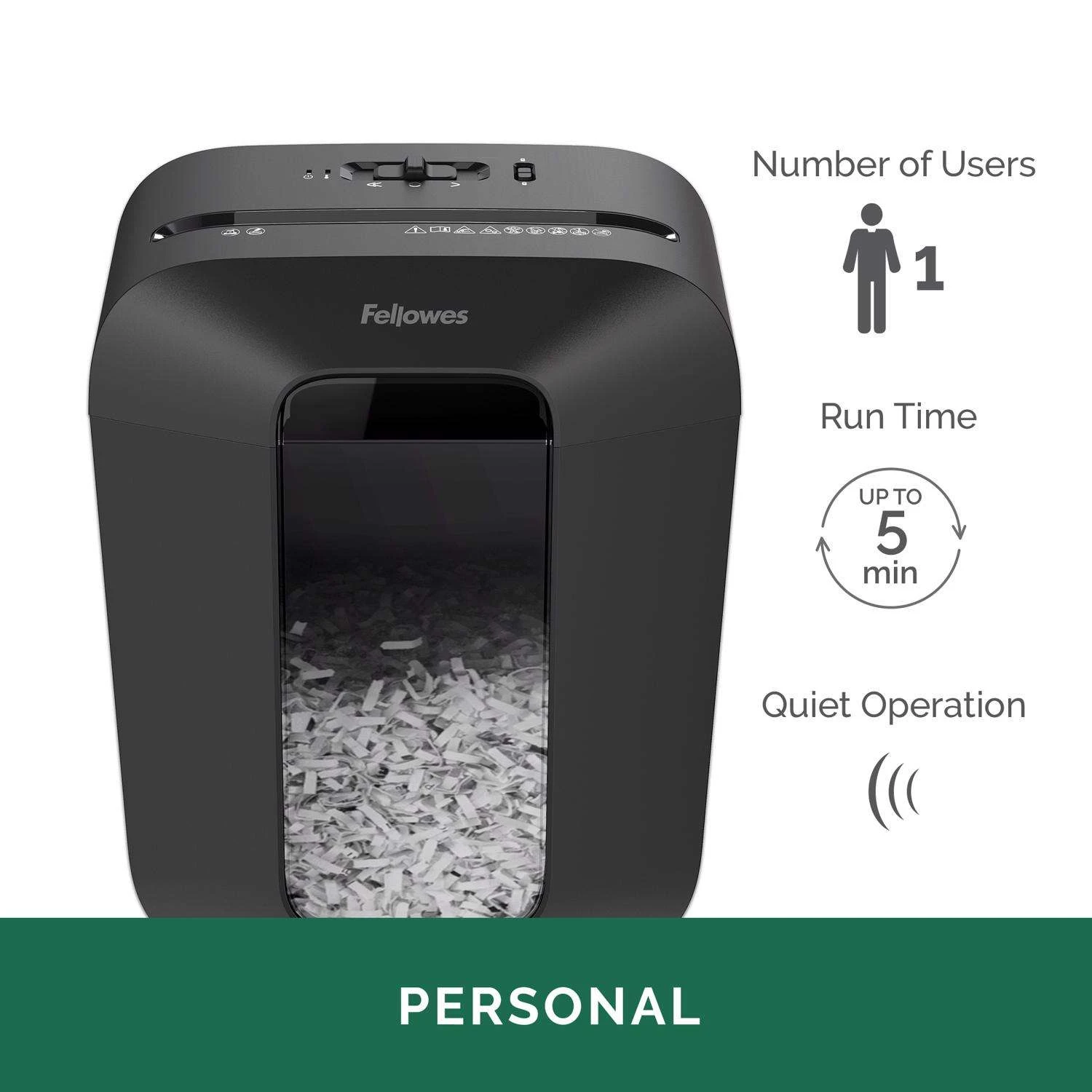 The Powershred LX50 cross-cut shredder is a reliable desk side shredder for personal use. Its elevated and sophisticated design brings distinction to any work or home office environment. The LX50 shreds 9 sheets per pass into 5 /32 in. x 1-7/16 in. cross-cut particles (Security Level P-4) and safely shreds staples, paper clips and plastic credit cards. Its 4.4 gallon waste bin with easy lift-off head holds over 198 shredded sheets and designed for individual use. Patented safetylock disables shredder for added safety protection Shreds for up to 5 minutes before a 30 minute cool down period is needed Quiet operation for home and small offices Usage: Medium Use