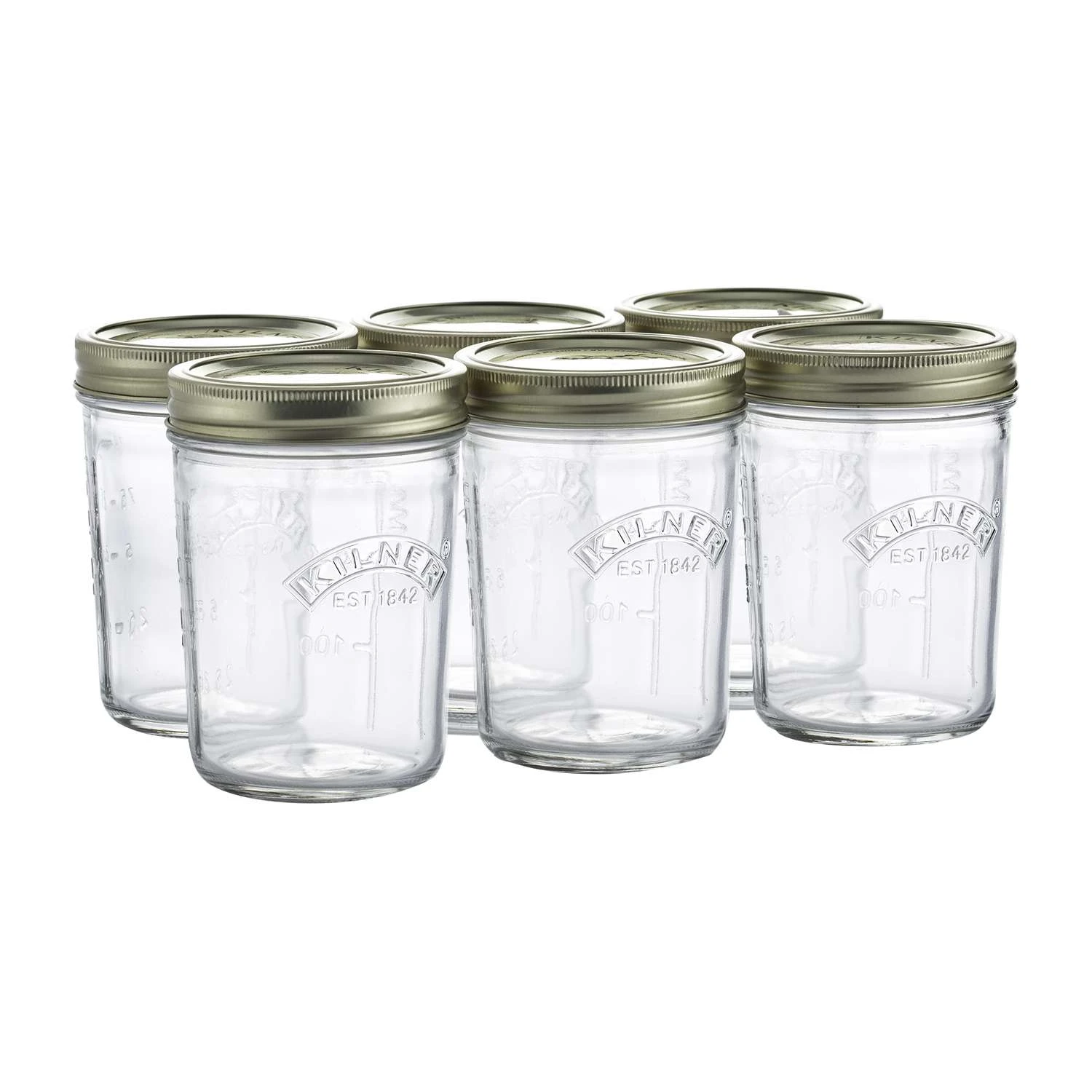 The tray of 6 Kilner Wide Mouth Jars are embossed with the Kilner logo and are perfect for canning whole fruits and vegetables as well as your favorite preserves, jams and jellies. The jars come with an easy to use metal screw top lid made up of two pieces a replaceable vacuum seal and a metal screw band to secure the seal. Easy to use Embossed measuring gauge on the side of jar Dishwasher safe