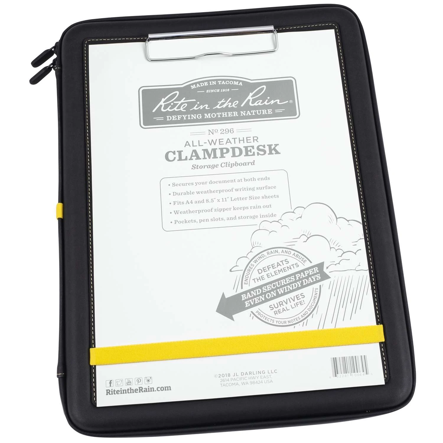 The Rite in the Rain Clampdesk secures your hard-earned notes and stores all of your field writing essentials. A strong clip and a second elastic band team up to lock down your document to the writing surface. Exterior pen loops keep a writing instrument at the ready. Inside the Clampdesk, handy mesh pockets permit storage of small field gear. More pen loops keep extra writing instruments secure and an elastic document pocket neatly stores a stack of your documents. The durable Clampdesk organizes and protects your critical desk items wherever you go. On windy days, hold your documents firmly on both ends with a strong clip and an elastic band Protect your documents not only from the wind, but the rain as well, a rubberized zipper saves your stuff on rainy days The desk holds up to 250 sheets of 8.5″ x 11″ Rite in the Rain printer paper, it also includes three internal storage pockets, perfect for writing instruments and other field equipment Unlike other clipboards, the durable and flexible EVA material wont break or crack, providing a reliable writing surface while youre on the job Write on either the front or back