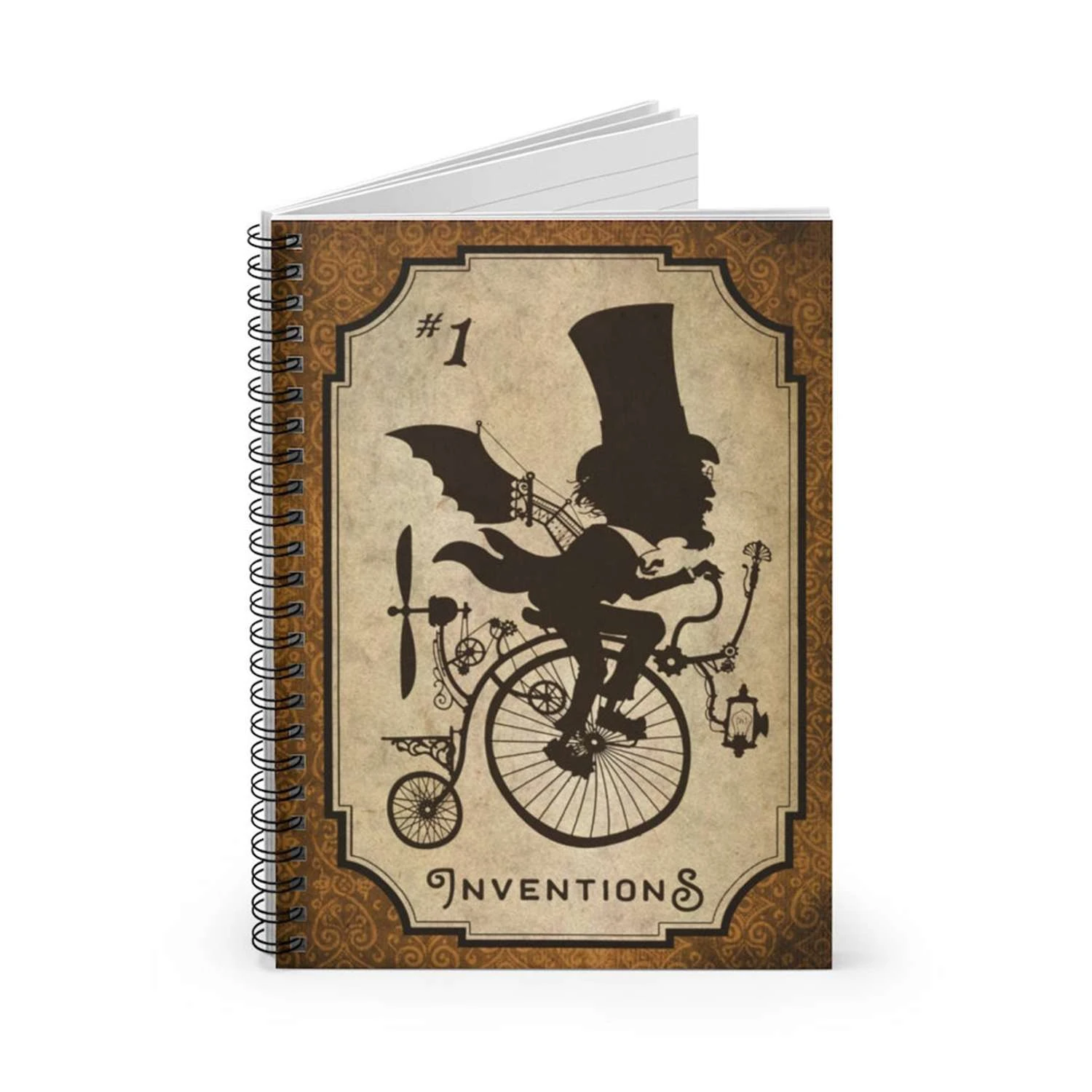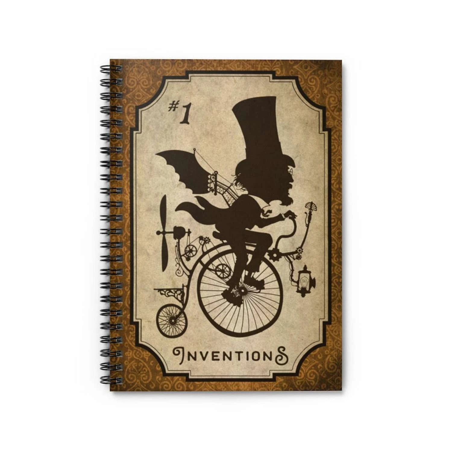 Inventions #1 (cycling inventor) – lined, spiral notebook. A fun and funny design printed on the cover. A great journal / notebook for keeping organized. Perfect for shopping lists, school notes or poems – 118 page spiral notebook with ruled line paper is a perfect companion in everyday life. Durable printed cover makes owner proud to carry it everywhere. Document pocket inside back cover for added storage, 90gms paper. Front cover print 118 ruled line single pages Charcoal gray back cover Metal spiral binding