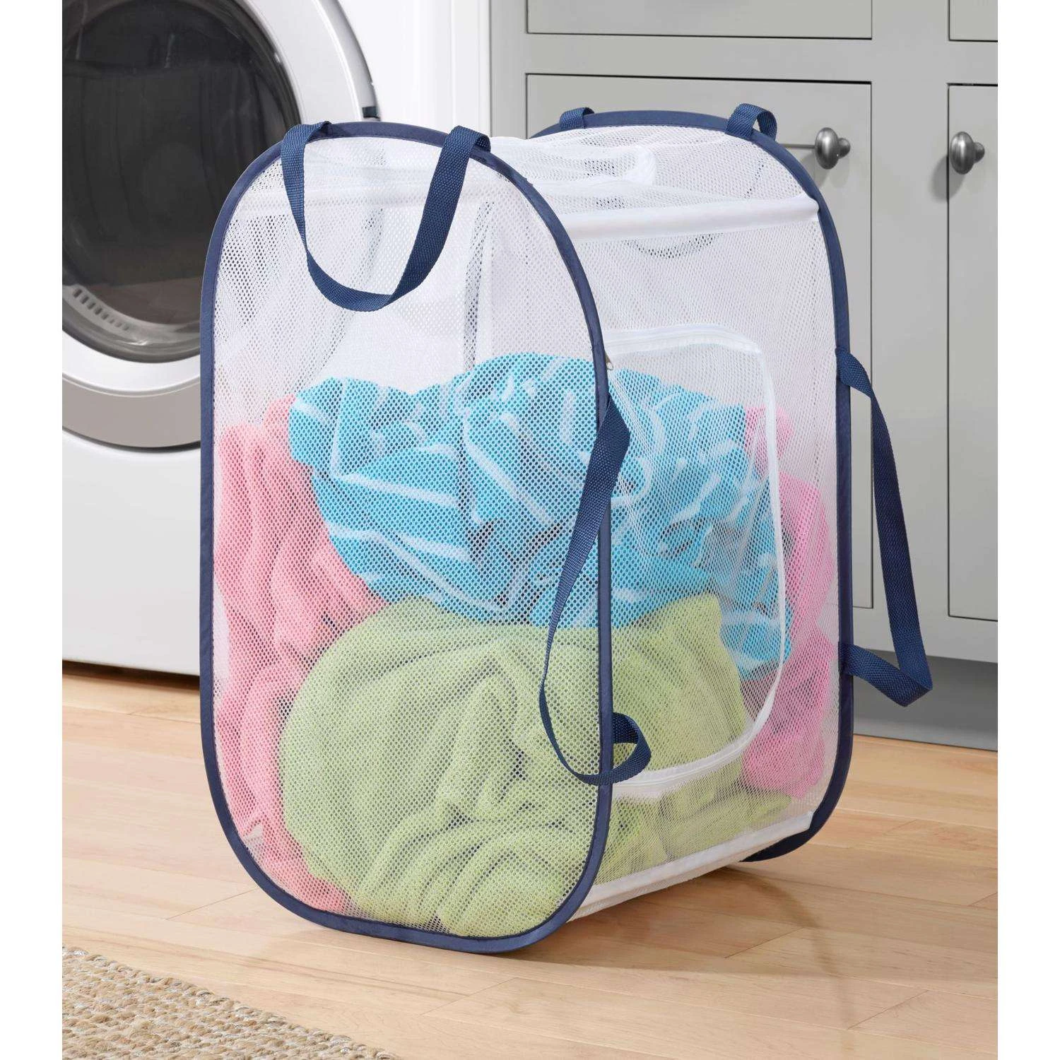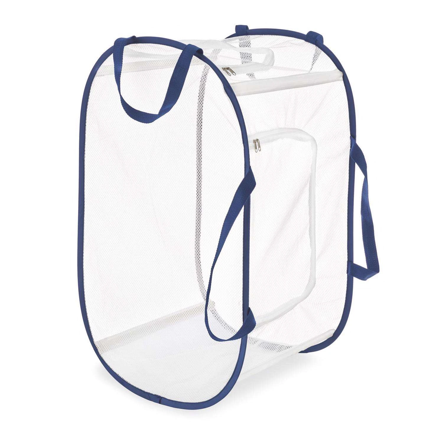 Make laundry day a little easier with this hamper that can be used vertically or horizontally to fit your needs. Its lightweight mesh and durable handles make transport easy and it collapses flat for easy storage. Made from polyester Shrinkwrapp w/fabric loop for hanging White with navy trim