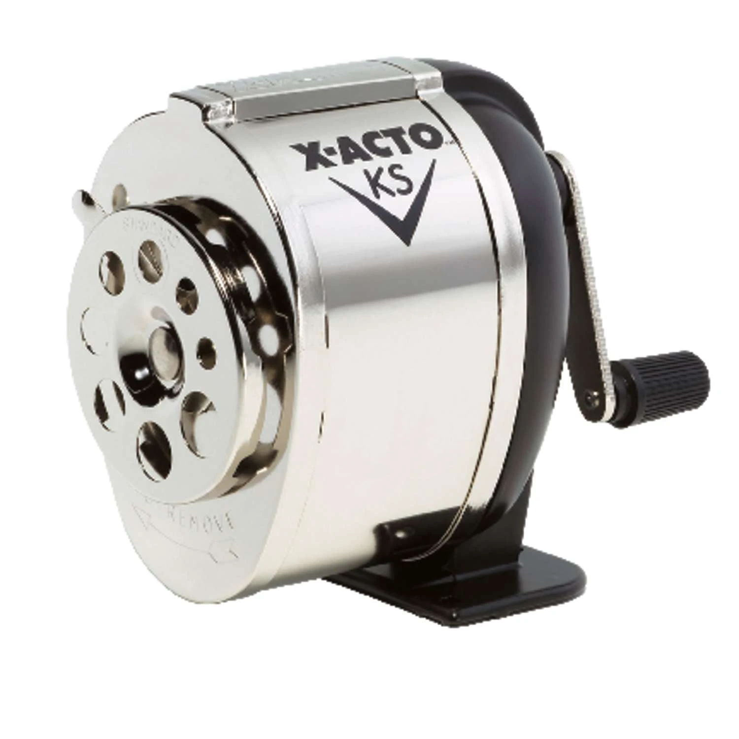 The X-Acto KS manual pencil sharpener is a traditionally styled pencil sharpener that mounts easily onto any horizontal or vertical surface. This KS manual pencil sharpener includes an 8-hole dial pencil selector. Able to stand up to continuous, heavy duty sharpening, this crank pencil sharpener makes a great addition to a workshop desk or table and this model features a brilliant metal finish. Features X-Acto dual hardened helical cutters Manual pencil sharpener is quick and convenient for anywhere use Die-cast metal base with steel shavings receptacle Features a 8-hole dial which conveniently sharpens assorted colors pencil widths Made of durable metal in a combination of black and silver